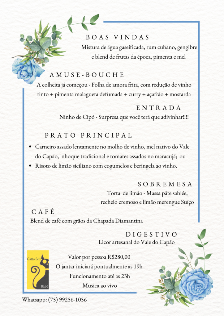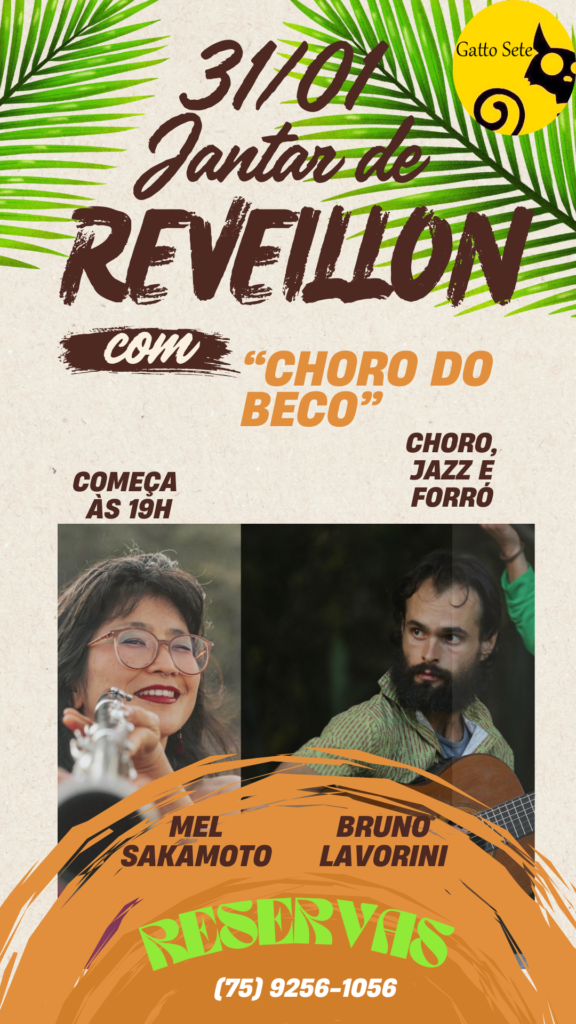 No jantar de réveillon de 2025/2026 do Gatto Sete, teremos o Show de Mel Sakamoto e Bruno Lavorini que são integrantes do grupo de chorinho “Chôro do Bêco” do Vale do Capão, e em duo diversificam o repertório e passeiam por temas do universo do samba e forró na composição 7cordas, clarineta, voz e percussões. Reservas para o jantar: Whatsapp (75) 9256-1056